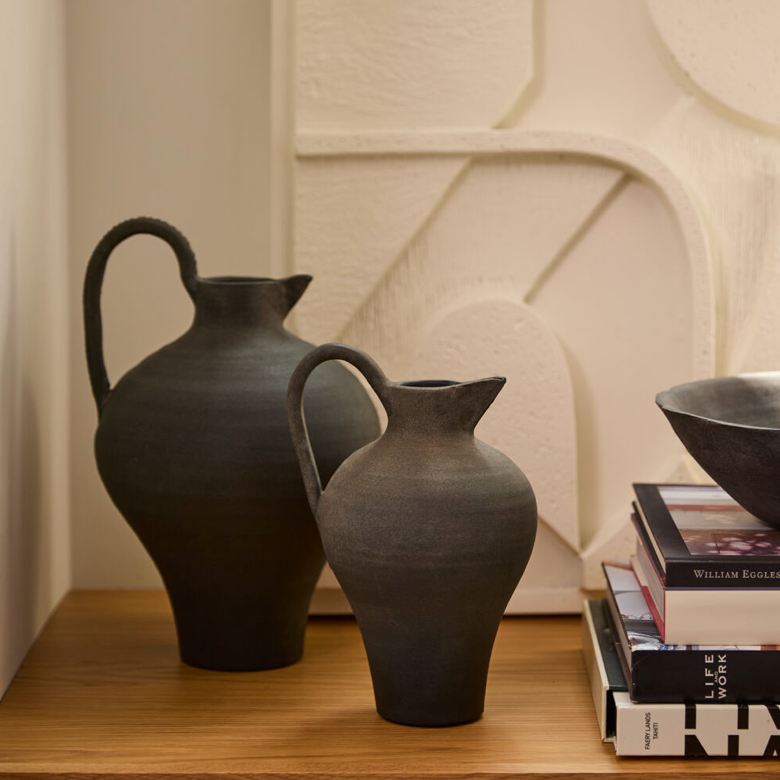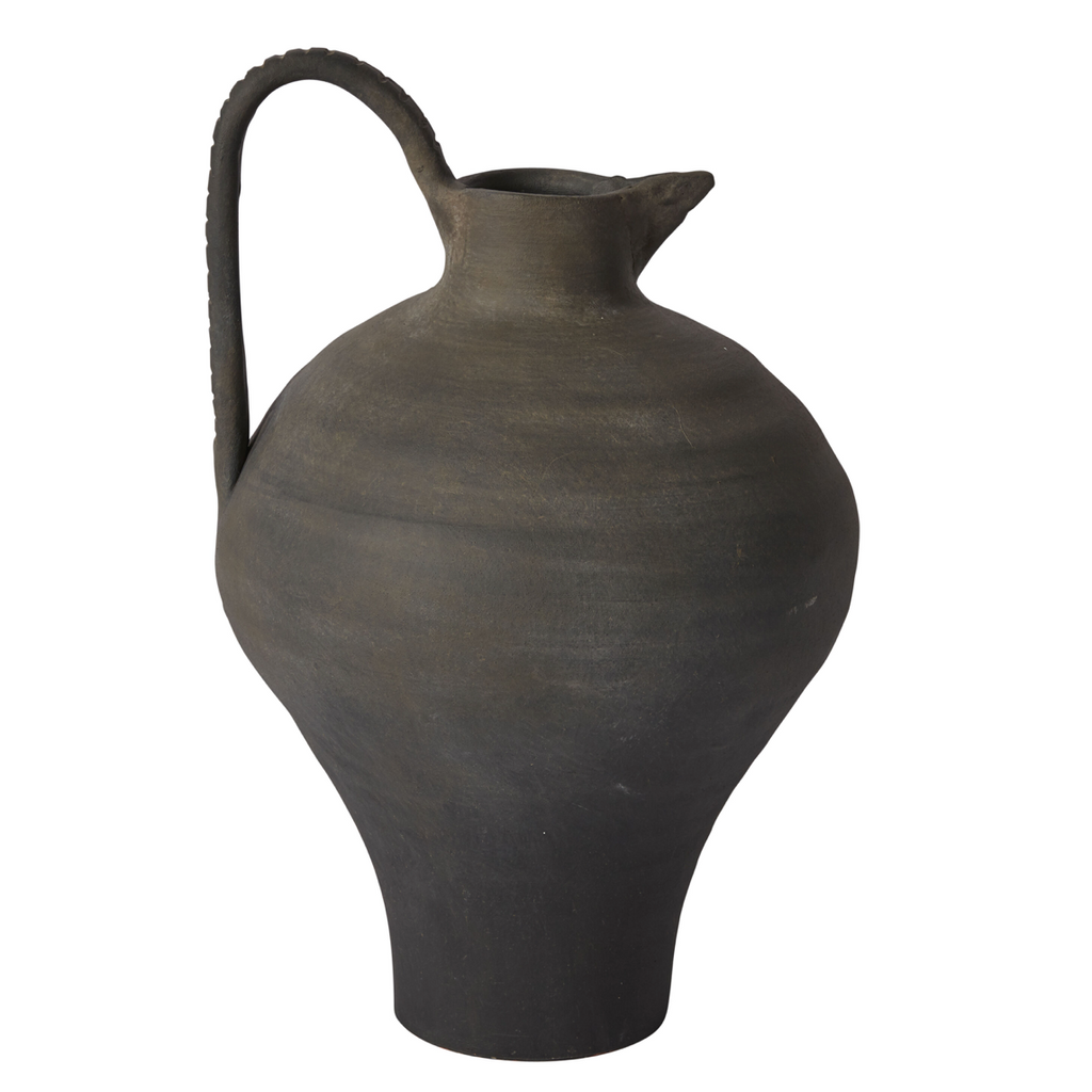The Ravine Jug captivates with dramatic curves and a statement handle. This small handmade terracotta pitcher, in an aged matte black finish, blends ancient beauty with modern simplicity. Ideal for shelf styling or as a vase (not food safe), it adds effortless elegance to any space.